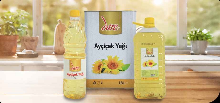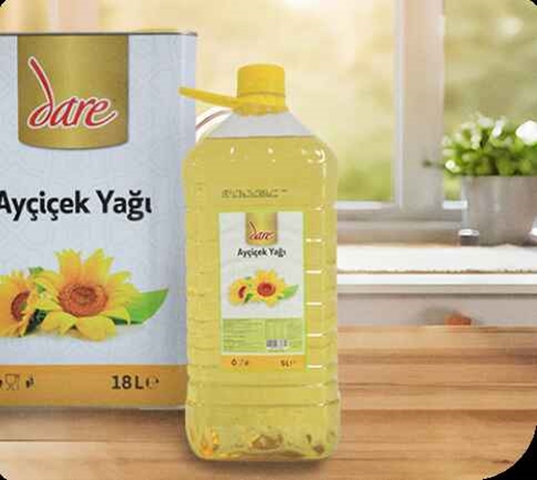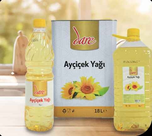 Mutfaklarımızın vazgeçilmezi olan ayçiçek yağını 1l, 2l, 3l, 5l ve 18l paketlerde, Dare markamızla tüketicilerimizin beğenisine sunuyoruz. Yüksek yağ oranı ve E vitamini açısından zenginliği ile bilinen ayçiçeğinden elde edilen ürünlerimizle yemeklere tat katıyoruz.